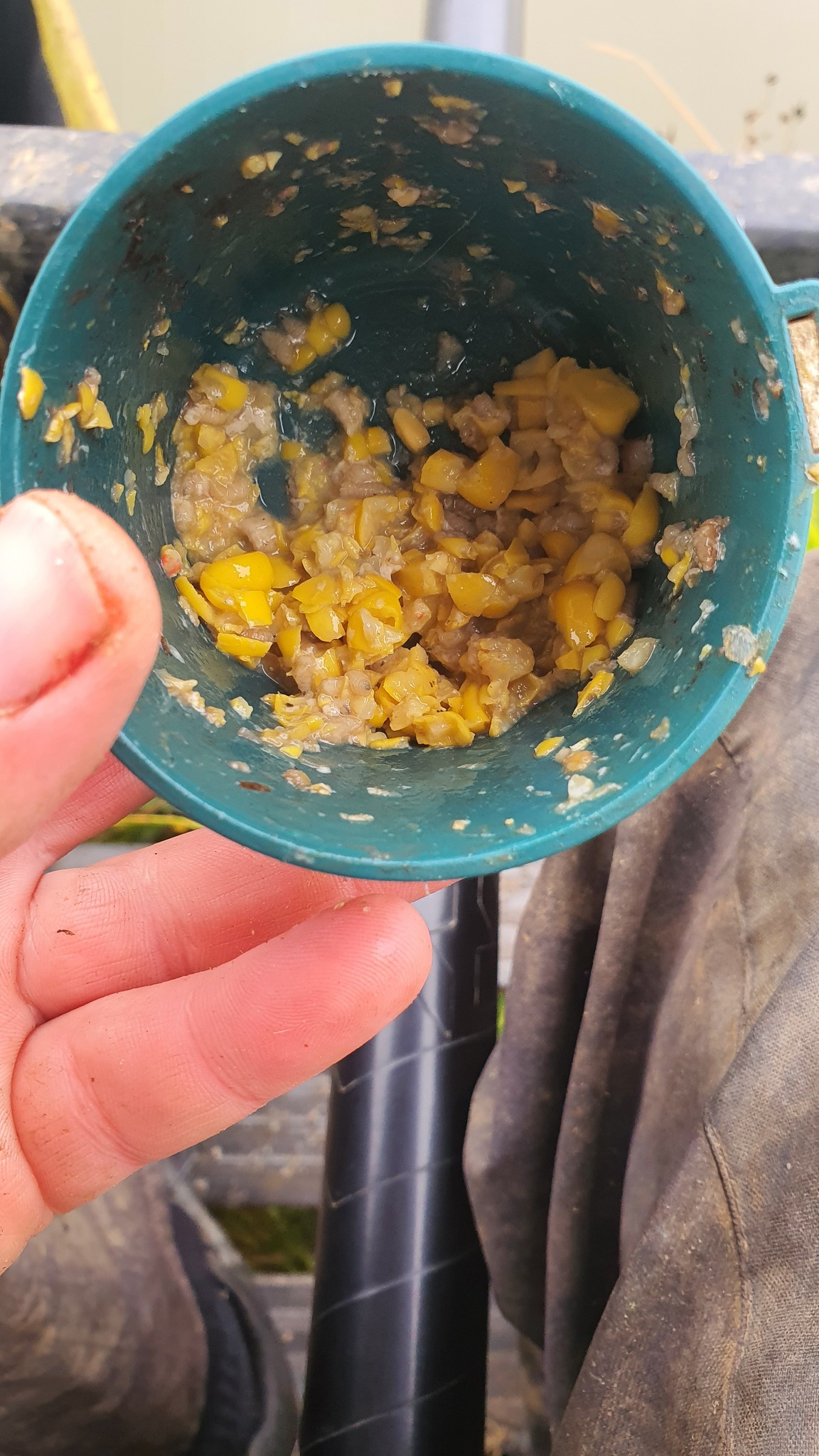 A pecáról pedig, alapozás, 4-5 gombóc annyira összenyomva, hogy leérjen egyben a fenékre. A gombócokba került kevés ollóval összevágott csonti és kukorica. A horgászat első órájában nem is etettem többet. A második órától pedig 20 percenként pici etetőanyag és vágott csonti és kukorica ment be. Mivel szúnyogot se etetni se pedig tűzni nem lehetett, így a fő csali csonti, pinki, giliszta, és ezek kombinációja volt. Négy óra alatt közel 40 db halat fogtam aminek az összsúlya 5800g volt.